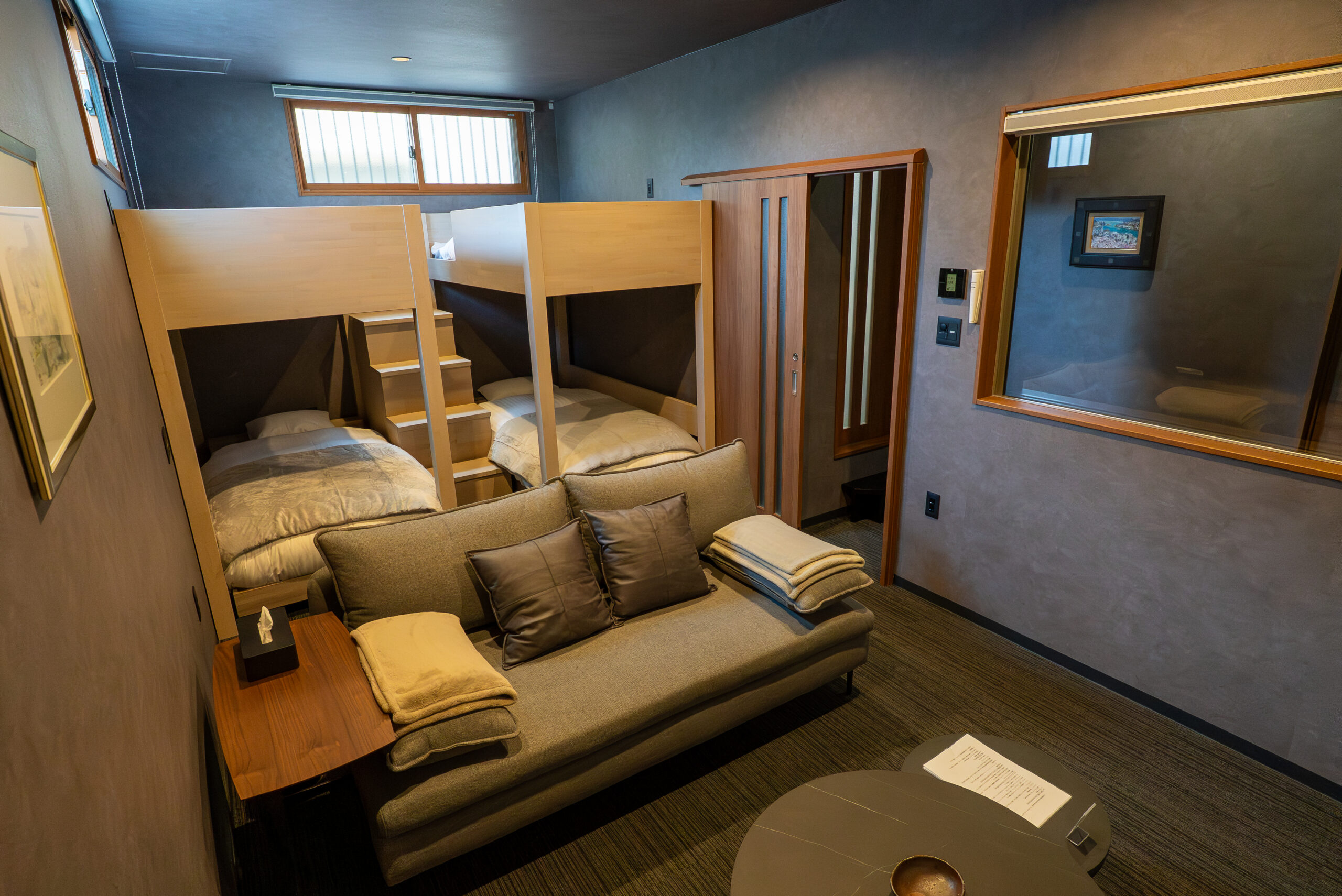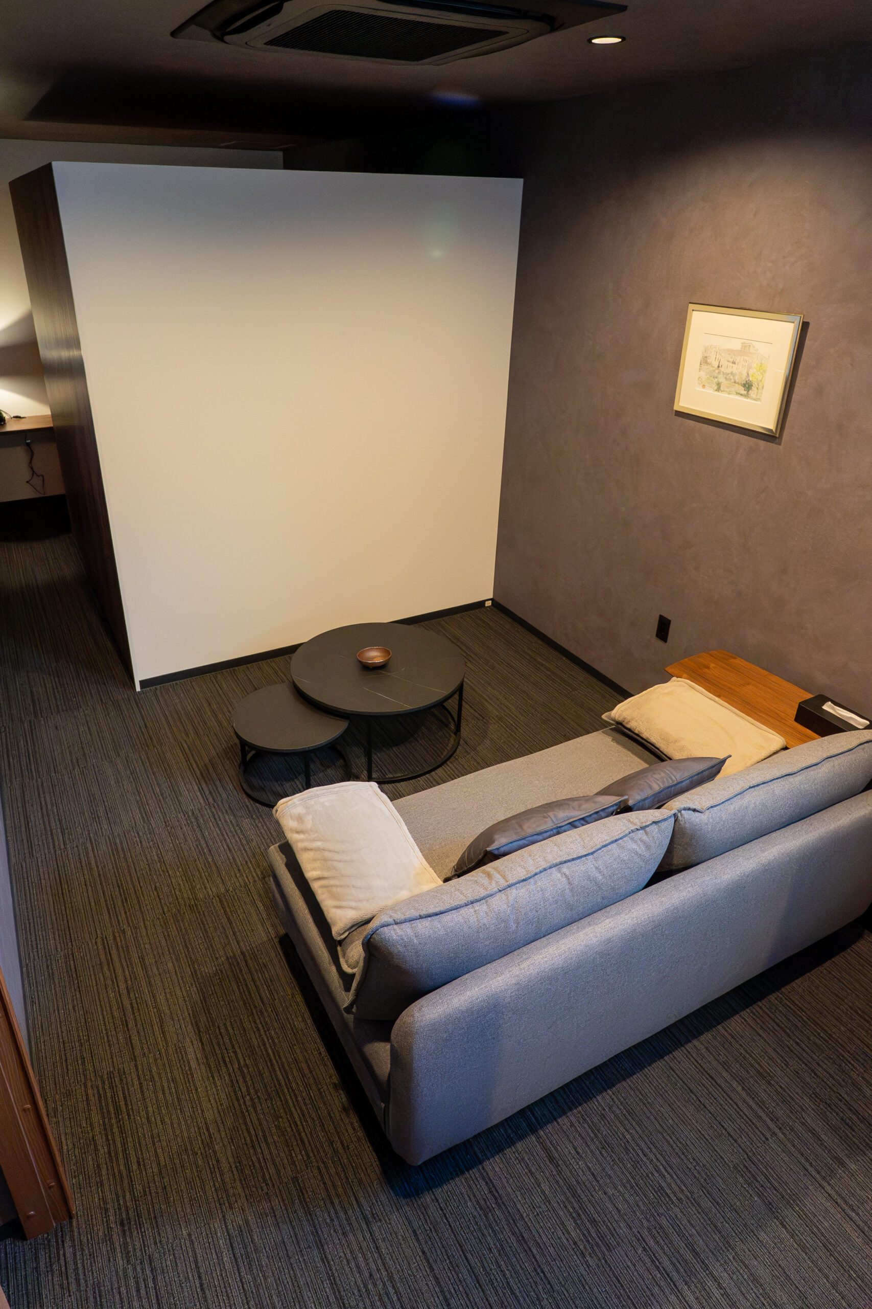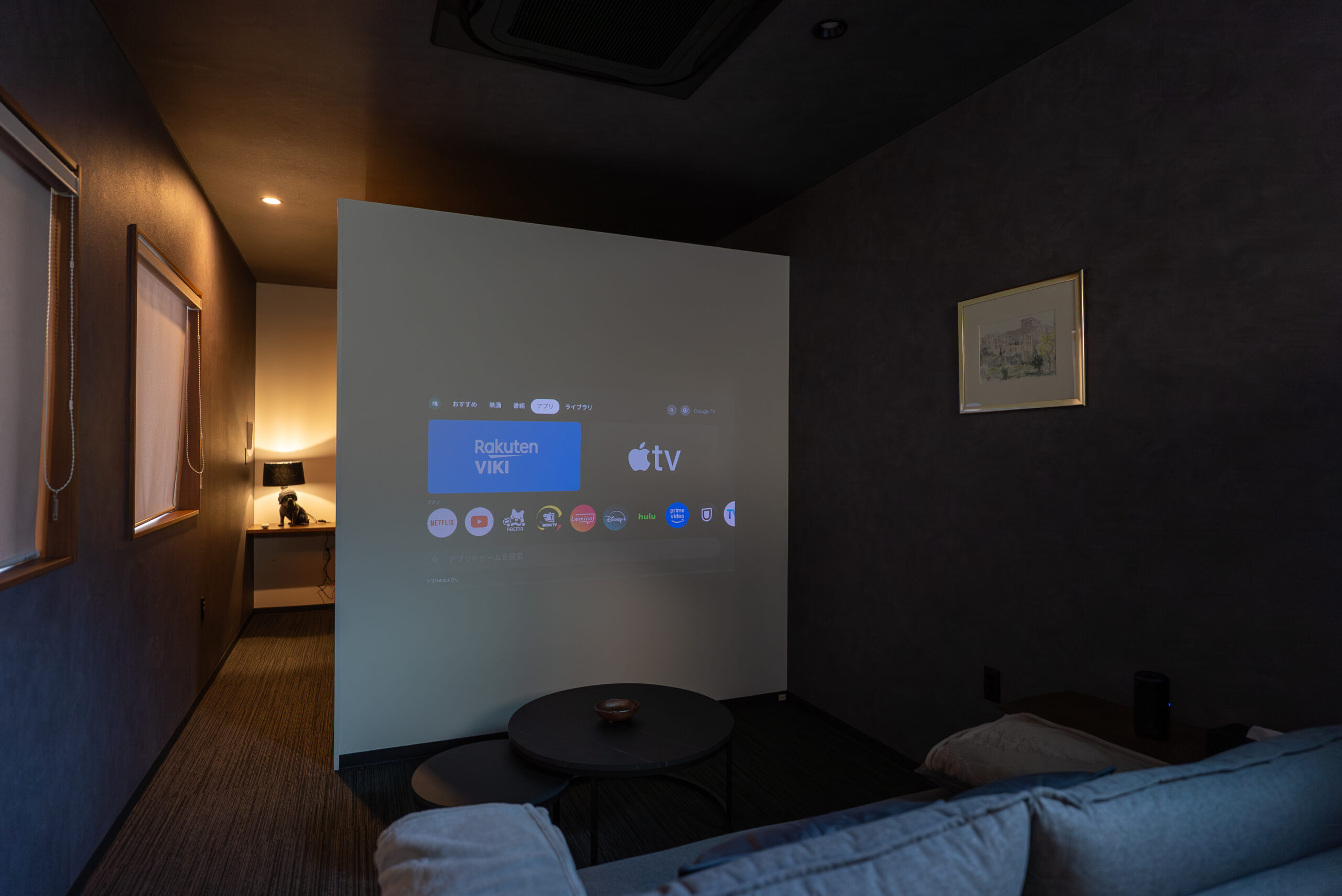 大きなソファとプロジェクターを備えたリビング。映画を楽しんだり、ボードゲームをしたりと、思い思いの時間を過ごせます。